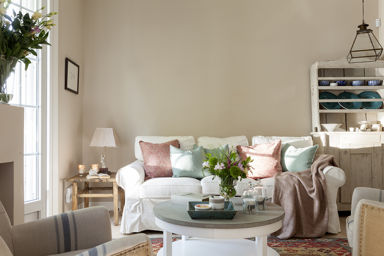 Renueva los cojines del sofá y pon tu sofá a la última Salón con sofá blanco y cojines y plaids azules, verdes y grises Cómo elegir los cojines según el color del sofá